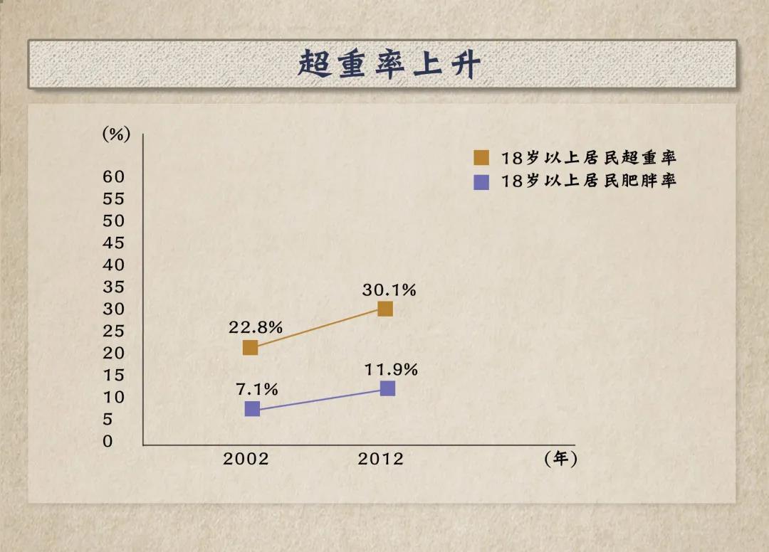 2002年至2012年,18歲以上居民超重率從2002年的22.8%升至30.1%,肥胖率從7.1%升至11.9%。2017年,全國(guó)歸因于高BMI(體重指數(shù))的心血管病死亡人數(shù)為59萬,占心血管病死亡總數(shù)的13.5%。